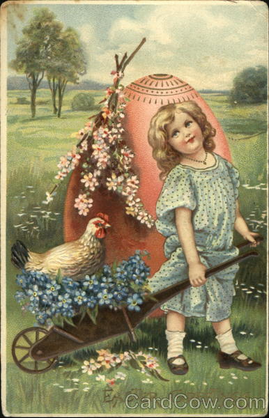 Girl in Blue Dress with Egg, Chicken, and Flowers