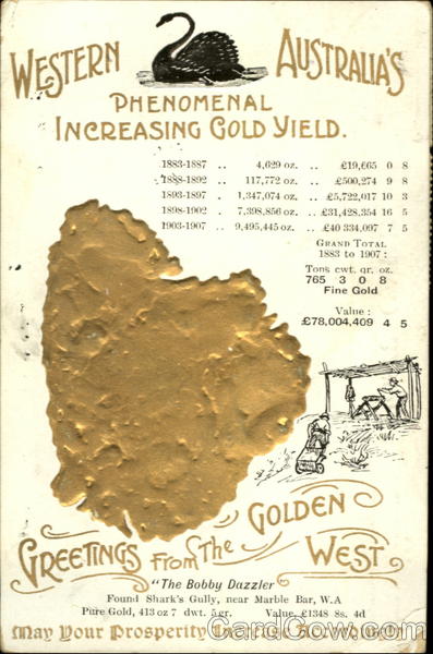 Western Australia's Phenomenal Increasing Gold Yield 1883-1887..4,629 oz..L19,665 0 8 1888-1892..117,772 oz..L500,274 9 8 1893-1897.1,347,074 oz..L5,722,017 10 3 1898-1902.7,398.856 oz..L31,428,354 16 5 1903-1907.9,495,445 oz..L40,334,097 7 5 Grand Total, 1883 to 1907 : 765 Tons 3 cwt. 0 qr. 8 oz. Fine Gold Value: L78,004,409 4 5 "The Bobby Dazzler" Found Shark's Gully, near Marble Bar, WA Pure Gold, 413 oz 7 dwt. 5 gr. Value, L1348 8s. 4d May Your Prosperity Increase Accordingly |