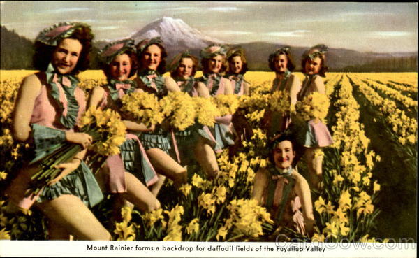 Mount Rainier forms a backdrop for daffodil fields of the Puyallup Valley