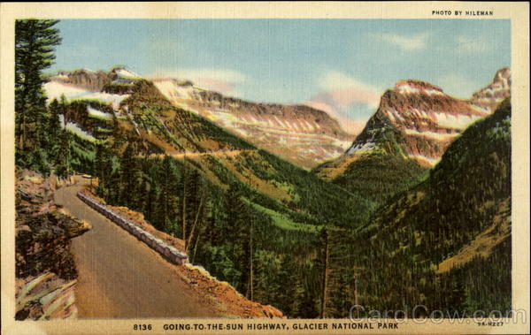 Front: PHOTO BY HILEMAN 5A-H227 8136 GOING-TO-THE-SUN HIGHWAY, GLACIER NATIONAL PARK Back: GLACIER PARK CO. **C.T.ART-COLORTONE REG. U.S. PAT. OFF.