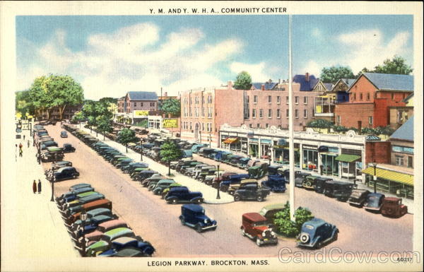 Front: Y. M. AND Y. W. H. A., COMMUNITY CENTER 60217 LEGION PARKWAY. BROCKTON, MASS. Back: POSEARD E-UIZOR OCJE>