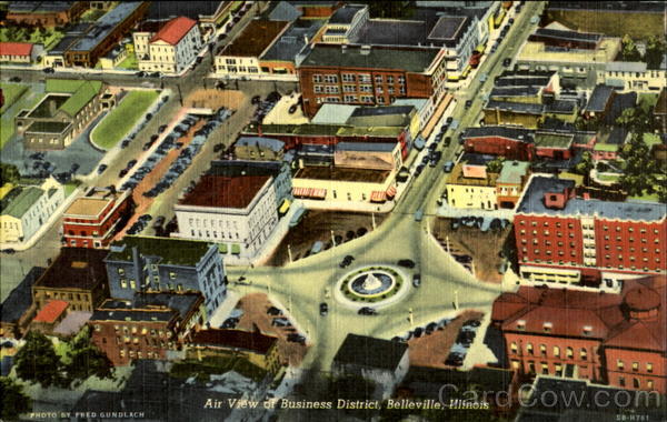 Front: 111 Air View of Business District, Belleville, Illinois PHOTO BY FRED GUNDLACH SB-H761 Back: DISTRIBUTED BY WALKOHL DRUG CO, BELLEVILLE, ILL.