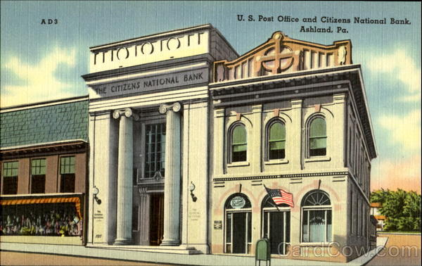 Front: AD3 U. S. Post Office and Citizens National Bank, Ashland, Pa. OTO TO TT THE CITIZENS NATIONAL BANK 1921 Back: MADE IN U. S. A PUB, BY R, RAMSAY MERANE. WILKES-BARRE, PA. 68814