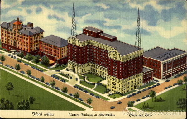Front: GARAGE Hotel Alms Victory Parkway at McMillan Cincinnati, Ohio Back: Hotel Alms Dan M. Myers, Mgr. "Cincinnati's Hilltop Hotel” 500 Rooms 500 Car Garage 4B-H663