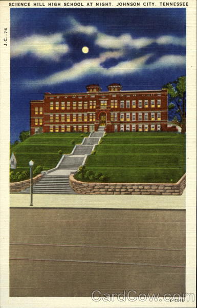 SCIENCE HILL HIGH SCHOOL AT NIGHT. JOHNSON CITY, TENNESSEE E-7418 J.C.-76