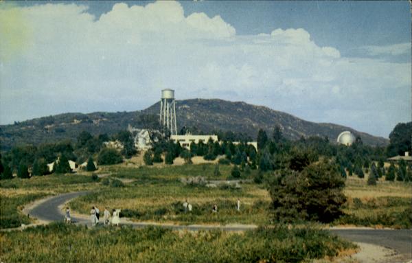 Scene showing the powerhouse, machine shop, water storage and 48" Schmidt Telescope in the background. In the extreme background is the U.S.F.F Fire Lookout Station. Elevation 6126 feet. The water supply for the area of 2040 acres comes from springs on the premises. All buildings are fire, earthquake and termite proof |