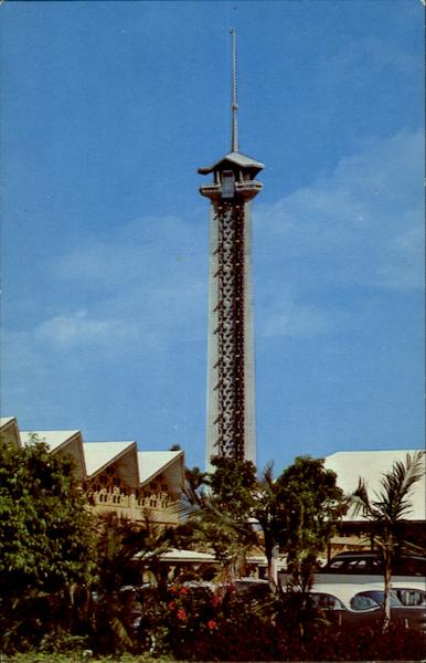 Series 42232-B D Bazaar Trylon, Florida's Tallest Tourist attraction rises 230 ft. on U. S. 1, fronting the "World's most unusual market place" in Riviera Beach. A glass elevator to the top shows a thrilling view of the Palm Beaches. Color by Larry Witt Rev. 8-61 42232-B D-8 Made by Dexter West Nyack, N.Y. Pub. by D&M Post Cards & Records Co., West Palm Beach, Florida |