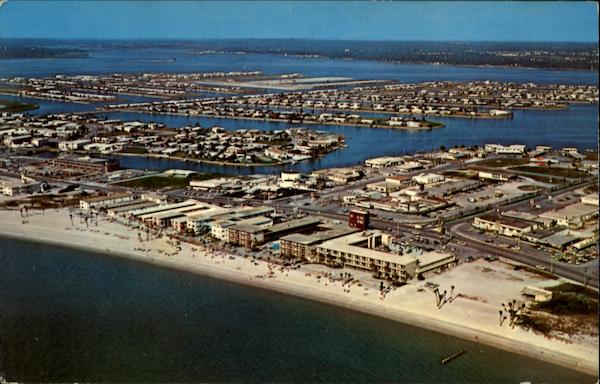 | on the Gulf of Mexico. Nationally famous for its magnificent beach and luxurious motels. Two well known landmarks, the Thunderbird's red brick pylon, and the Buccaneer Motel, are clearly visible beside the beach. All of the homes in the background are built on land pumped from the bottom of Boca Ciega Bay |