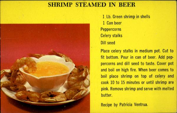 | 1 lb. Breen shrimp in shells 1 can beer Peppercorns Celery stalks Dill seed Place celery stalks in medium pot. cut to fit bottom. Pour in can of beer. Add peppercorns and dill seed to taste. Cover pot and boil on high fire. When beer comes to boil place shrimp on top of celery and cook 10 to 15 minutes or until shrimp are pink. Remove shrimp and serve with melted butter. Recipe by Patricia Ventrua. Dukane Press Hollywood Fl Dukane Press inc. hollywood fl 33020## D00167 |