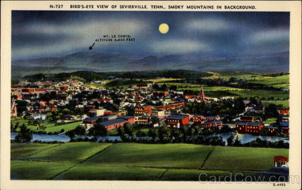 N-737 BİRD'S-EYE VIEW OF SEVIERVILLE, TENN., SMOKY MOUNTAINS IN BACKGROUND. MT. LE CONTE, ALTITUDE 6,600 FEET E-4493