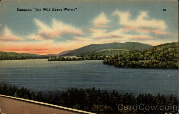 Front: Sunapee, "The Wild Goose Waters" 19 Back: MADE IN U. S. A 25 *TICHNOR QUALITY VIEWS" REG. U.S. PAT, OFF. MADE ONLY BY TICHNOR BROS., INC., BOSTON, MASS. 72896 PUB. BY RELIABLE PAPER & SUPPLY CO., CLAREMONT, N. H.