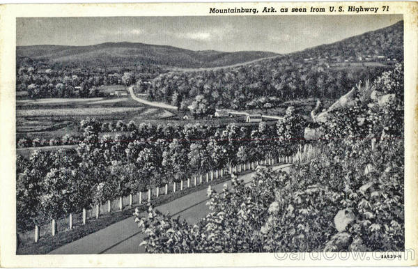Front: Mountainburg, Ark. as seen from U. S. Highway 71 4A639-N Back: MR. AND MRS. E. A. BELLIS, MT. GAYLER, ARK. GENUINE CURTEICH-CHICAGO "C.T. PHOTO-COTE POST CARD (REG.U.S.PAT.OFF.) Aug/211 POST CARD