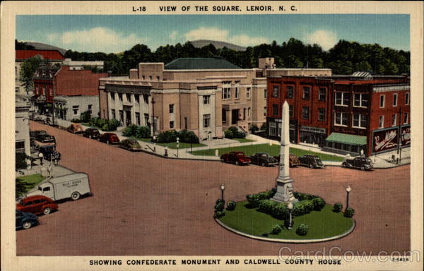 L-18 VIEW OF THE SQUARE, LENOIR, N. C. BLUE RDOE SHOWING CONFEDERATE MONUMENT AND CALDWELL COUNTY HOUSE E-8836