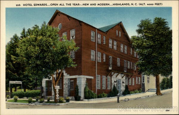 926 HOTEL EDWARDS....OPEN ALL THE YEAR....NEW AND MODERN....HIGHLANDS, N. C. (ALT. 4000 FEET) HOTEL EDARDS 264 FFED