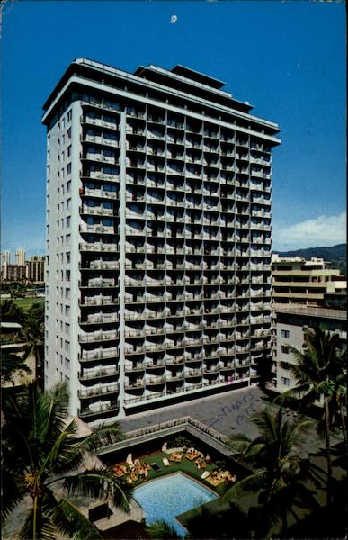 Series SC15454 Waikiki Village Hotel located just one half-block from the beach at the heart of Waikiki, Honolulu, Hawaii. 440 rooms with color TV and fully air conditioned. Shops, Restaurants, Cocktail Lounges and an Underwater View Bar are features |