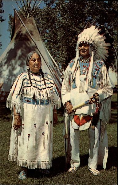 Lastic Chrome Series P45713 Chief Bull and Mrs. Bull proudly display the authentic and colorful ceremonial dress worn in many Montana Indian celebrations. Proud of the heritage handed down from the past, the American Indian has begun to share an important and well-deserved place in modern society Bob Anderson Postcards |