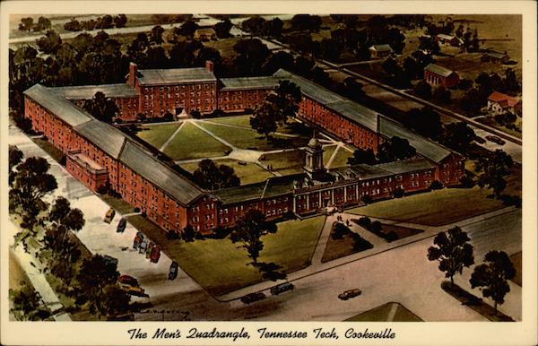 | The Men's Quadrangle, Tennessee Polytechnic Institute, Cookeville, Tennessee. A number of dormitory units for men, all connected in the form of a quadrangle yet with each unit possessing a distinct identity of its own, provides housing, study and recreational facilities for some 700 Tech men |