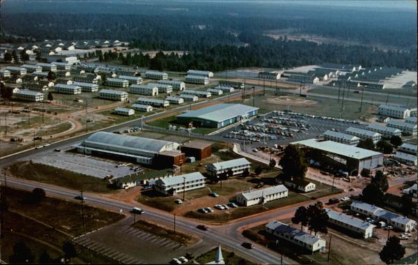 Aerial view of the 2nd Training Brigade area, showing the Main Post Exchange with its adjacent parking area. Fort Polk is one of the Army's largest basic training centers