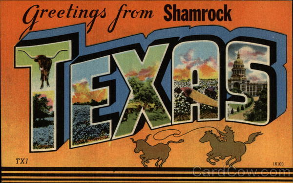 Front: Greetings from Shamrock HEXAS TX1 16103 Back: G. W. A: "COLOURPICTURE" PUBLICATION, BOSTON 15, MASS.; U.S.A.