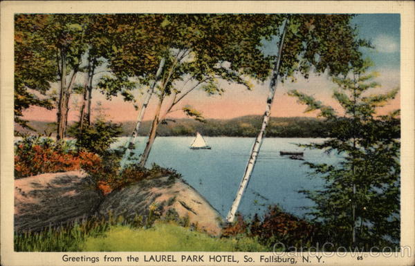 Front: Greetings from the LAUREL PARK HOTEL, So. Fallsburg, N. Y. 65 Back: PUB. BY FALLSBURG PRINTING CO., COHEN BROS., SO. FALLSBURG, N. Y.
