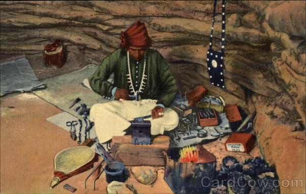Da Pah, a Navajo Indian Silversmith working in his hogan in Gallup, N.M., in which more silver is produced within a radius of forty miles of here than at any other point. His skillful work is done with the primitive tools shown in the picture. His materials are coin silver and turquoise, the silver is heated and then hammered to suit his purpose. Genuine Indian jewelry is much in demand on account of its beauty and original design, there never being two pieces alike Southwest Post Card Co |