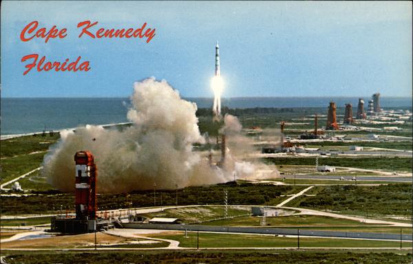 Front: Cape Kennedy Florida Back: AERIAL VIEW CAPE KENNEDY, FLORIDA Showing Martin's Titan as it blasts off on a 6,000 mile trip down the Atlantic Missile Range. Central Florida Distributors, 2021 W. Fairbanks Ave., Winter Park, Fla. 61110 Address