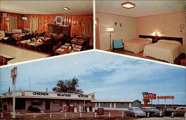 Motel - New in 1960. Ultra-modern with individually controlled electric heat. Free T. V. Restaurant - Art's fine foods under the same management for 25 years. Service Station - Conoco Gas and Oils. On U.S. 66 - Twenty mi. South of Springfield at Farmersville, Illinois; Phone 7-2371; Elmer and Joe McAnarney, Owners Dexter |