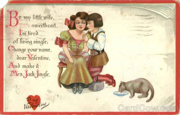 Be my little wife, sweetheart, I'm tired of living single; Change your name, dear Valentine, And make it Mrs. Jack Jingle.