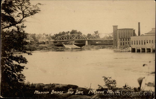 Front: 177 MADISON BRIDGE AND DEM, MADISON ME, 12. Back: Why the dickers don't you ever with. I suppose this place looks familiar. about 2 feet of snow and calglas om ANSON WAN 113 7AMS Mr. Lester Pollard 104 W. Peoria St, Pasadena Cal.