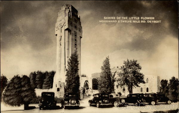 Front: SHRINE OF THE LITTLE FLOWER WOODWARD & TWELVE MILE RD. DETROIT - Back: THIS IS A GENUINE PHOTOGRAPH MADE BY THE GROGAN PHOTO SERVICE-TROY AT 21ST ST., CHICAGO, ILL. HERE