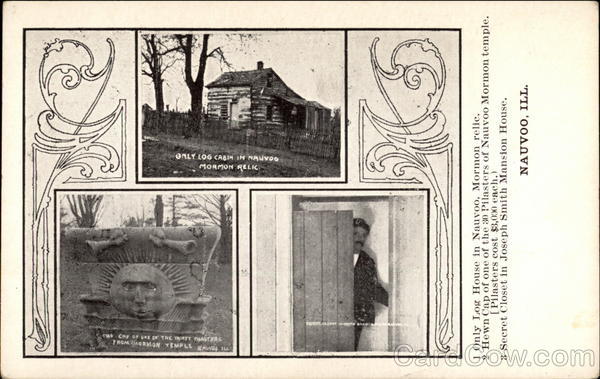 1. Only Log House in Nauvoo, Mormon relic. 2. Hewn Cap of one of the 30 Pilasters of Nauvoo Mormon temple. 3. Secret Closet in Joseph Smith Mansion House