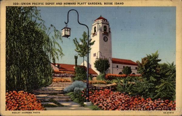 Front: 320-UNION PACIFIC DEPOT AND HOWARD PLATT GARDENS, BOISE IDAHO WESLEY ANDREWS PHOTO 5A-H1810 Back: “C.T.ART-COLORTONE'' REG.U.S. PAT. OFF.-WESLEY ANDREWS CO., PORTLAND, ORE.