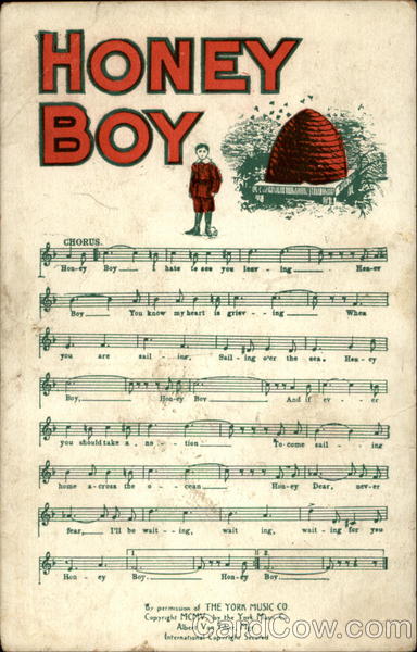 Music Series 460 Honey Boy I hate to see you learing Honey Boy you know my heart is grieving. When you are sailing , Sailing over the sea. Honey Boy, Honey Boy, And if ever you should take a notion To come sailing home across the ocean. Honey Dear, never fear I'll be waiting, waiting, waiting for you. Honey Boy. Honey Boy |
