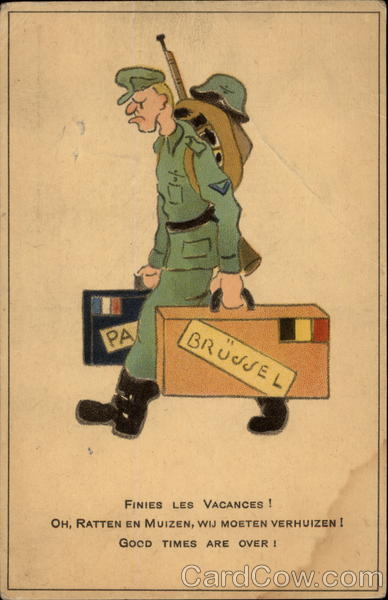 Front: PA BRUSSEL FINIES LES VACANCES! OH, RATTEN EN MUIZEN, WIJ MOETEN VERHUIZEN ! GOOD TIMES ARE OVER ! Back: REPRODUCTION INTERDITE MADE IN BELGIUM