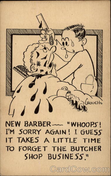 "Whoops! I'm sorry again! I guess it takes a little time to forget the butcher shop business."