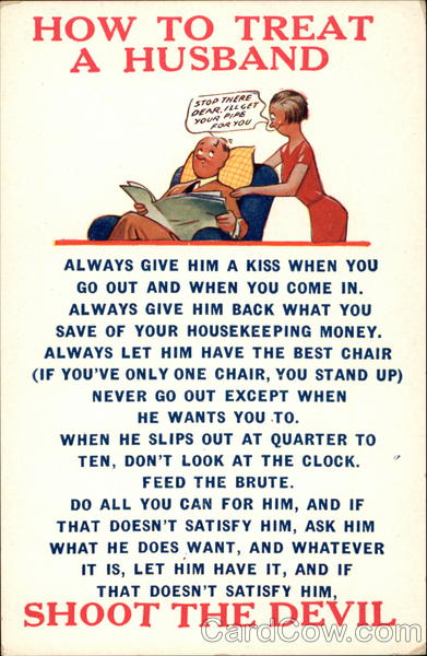 Domestic Comics Series 13544 Always give him a kiss when you go out and when you come in. Always give him back what you save of your housekeeping money. Always let him have the best chair. (If you've only one chair, you stand up.) Never go out except when he wants you to. When he slips out at quarter to ten, don't look at the clock. Feed the brute. Do all you can for him, and if that doesn't satisfy him, ask him what he does want, and whatever it is, let him have it, and if that doesn't satisfy him, shoot the devil |