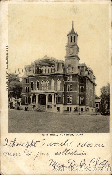 Front: PUBLISHED BY E.A.BARDOL & CO. LE 11 11 LE CITY HALL, NORWICH, CONN. I thought I woulil adal nie 4. Mrs. D le. Phelpr more to four colliction Back: SAAL HAVEN Postcode NOV 9 1906 00 1706 FRANKLIN 1790 Shine kulia Worthinglon Moodus boule (0