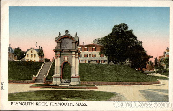Front: (15550) PLYMOUTH ROCK, PLYMOUTH, MASS. Back: Ona Cent for United States and Island Possessions Cuba, Canada and For Foreign. MUNCHEN LEIPZIG RECHNER BROS BOSTON
