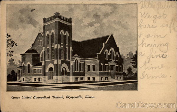 Front: UT We got Ham here soft having time. MM fine Grace United Evangelical Church, Naperville, Illinois. Back: Lan ego AUG 23 5 PM 1909 ya Miss Isabelle Acontius. 660 Grand Aves Chicago, Illa