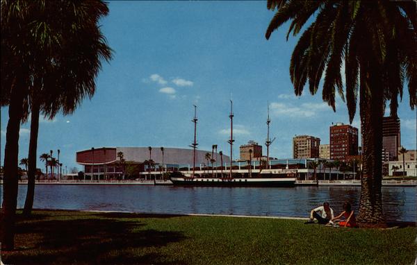 as seen from the beautiful campus of the University of Tampa across the Hillsborough River. The Gasparilla pirate ship is moored in front of the Convention Hall. Downtown Tampa, Florida forms the background