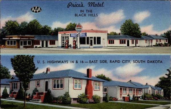 | Price's Motel AAA Rapid City, S. Dak. U.S. Highways 14 and 16 Guest Cottages in addition to Motel, with and without kitchens. Insulated -- cool in summer. Furnace heat. New, modern swimming pool, park and playground three blocks south. Cafes near. Three minutes from downtown. Reasonable Rates. T.V. available. Attractive Lobby Phone FIllmore 2-6272 Mr. and Mrs. Richard R. Price |