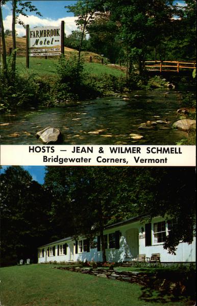 Hosts -- Jean & Wilmer Schmell Farmbrook Motel Located in the Heart of Grean Mountains, on route 100A, 3 miles from Coolidge Birthplace. Quiet, cool, restful, outdoor fireplaces, kitchenettes, electric heat. Telephone 802-672-2151