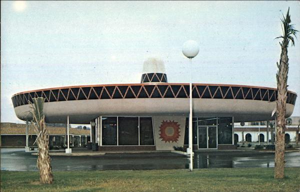U.S. Highways 301, 501; South Carolina at the N.C. - S.C. Border; Pedro's beautiful, new motel office, west. The sombrero brim provides out-of-the weather parking for 16 cars. One more unique South of the Border attraction! (For reservations: dial toll free: 800-845-6011 |