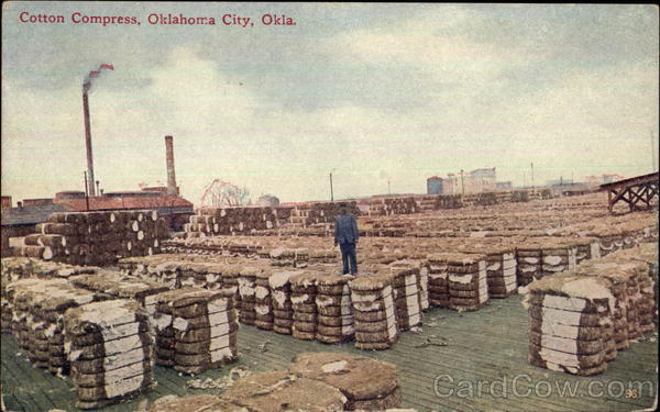 | Oklahoma City is the capital of the recently created state of Oklahoma. It is the principal city in that state. During the cotton season thousands of bales of cotton are brought to the compress to be compressed in bales so they may be shipped over the entire world. A bale of cotton weights about 500 pounds |