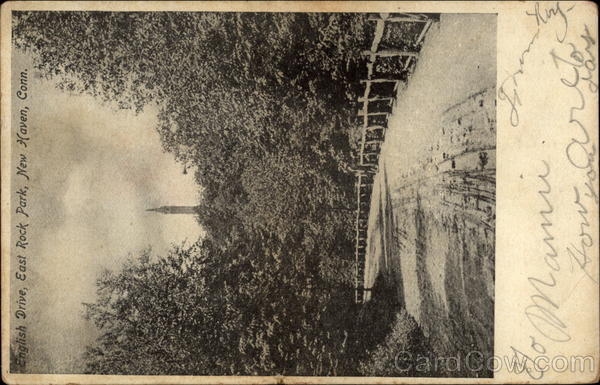 Front: English Drive, East Rock Park, New Haven, Conn. To Mamie How das Back: For Correspondence. In effect March 1, 1907. sorbong wifey Mamie Grüße 13 Benham Handen C