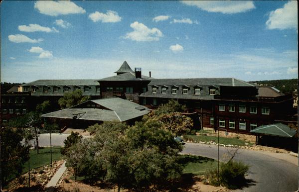 | Situated on an unparalleled site on the South Rim of the Grand Canyon, El Tovar is one of the most famous hotels in the southwest. It is a long, low structure of native boulders and pine logs. (Open all year.) Fred Harvey Motels-Shops-Restaurants Kodachrome Reproduction |