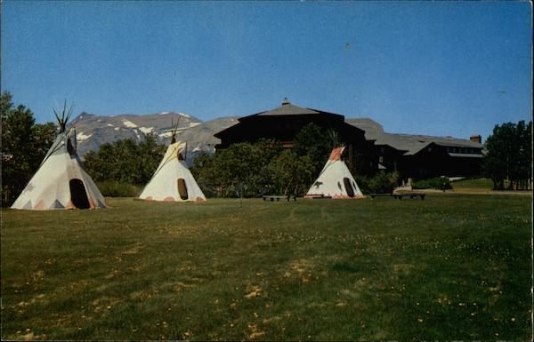 GLACIER PARK HOTEL – EAST GLACIER, MONTANA. Black- feet Indians in genuine Indian War dress greet the tourists at this main entrance to Glacier National Park. C-1679 Ektachrome by J. Boyd Ellis Published by J. Boyd Ellis, Arlington, Washington 17168