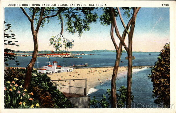 Front: LOOKING DOWN UPON CABRILLO BEACH, SAN PEDRO, CALIFORNIA T230 Back: 135484 L. A luodwoo tichnor art