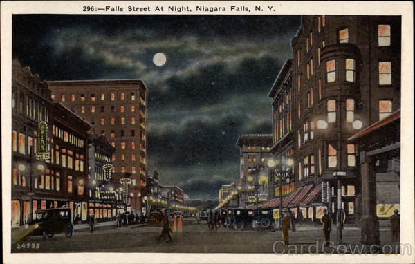Front: 296:-Falls Street At Night, Niagara Falls, N. Y. 24595 Back: DHP 2 2 2 THIS, SPACE FOR WRITING Place the Stamphere and Island Possessions Cuba, Canada and Doc Mc * M M