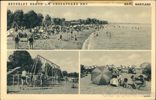 Front: BEVERLEY BEACH CN CHESAPEAKE BAY MAYO, MARYLAND D-5349 Back: Iw BEVERLEY BEACH ON CHESAPEAKE BAY Located 11 miles from U. S. Naval Academy at Annapolis, Md., 28 miles from Washington, D. C., and 32 miles from Baltimore, Md.